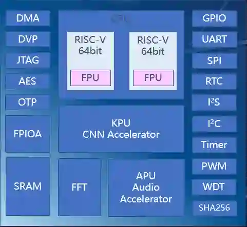 勘智K210是一款内置了卷积神经网络的系统级(SoC)AI芯片,基于RISC-V架构开发,其内置的KPU(knowledge processing unit)可以在低功耗下完成CNN计算,实现人脸检测、识别及目标分类等。