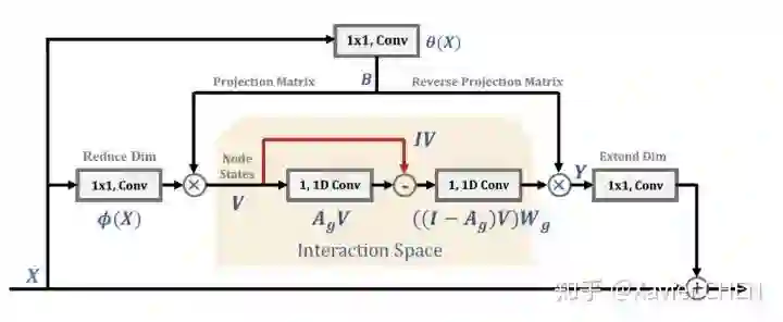 作者找到了一种简介的表示方法来实现上述目的,使用简单的1x1卷积做空间投影,使用图卷积做information diffusion。图卷积中不同节点的依赖关系也是依靠1x1的卷积学习得到。
