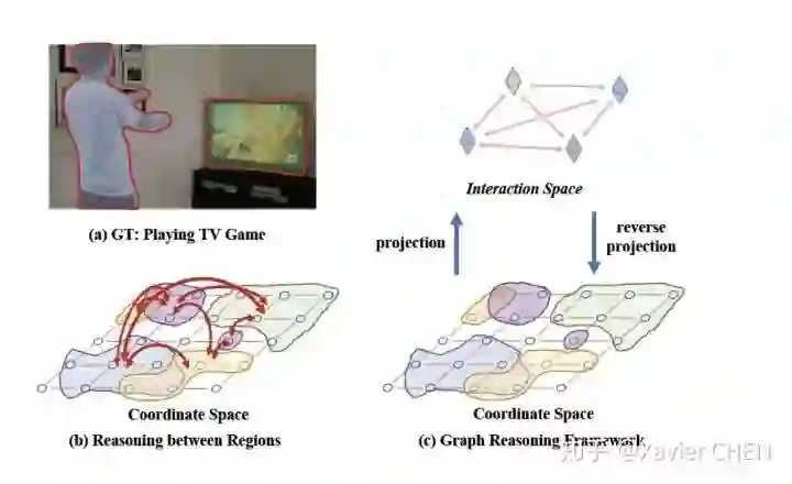 我觉得这是最好的一篇文章,利用GCN建立不同region之间的relation。本文的核心思想如下图,在图像几何空间(coordinate space),由于每一个像素都有特征表示,所以特征维度非常高,这么多的特征之间,不容易进行信息流动。如下图:最好的情况就是把a图投影到一个Interaction space, 把每个像素投影到不同的节点,比如:人,墙壁,电视机。。。然后再利用这些节点之间的依赖关系进行信息流动,之后再把这些信息交互过的节点,投影回到之前的坐标空间。