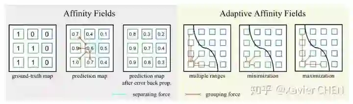 这篇文章的思路很简洁:属于同一个类别的两个像素之间的语义表示要尽可能相似,属于不同类别的语义表示需要距离更远,于是作者引入度量学习的思想,在一定的区域内利用Affinity Fields, 使得每个小区域内属于同一个类别的像素特征尽可能相似,不同类别像素尽可能有区别。这个思想其实也是“把逐像素预测问题变成一个更加宏观的预测”