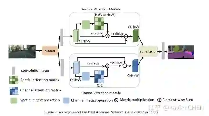 在spatial维度是完全一样的思路,利用Non-local结构建立long range relation。不仅如此,这篇文章还把self-attention的思想拓展到了channel维度,由于不同的channel代表不同的滤波器响应,在高层特征中可以代表不同的语义概念,作者希望利用channel-wise attention建立不同语义类别之间的依赖关系。