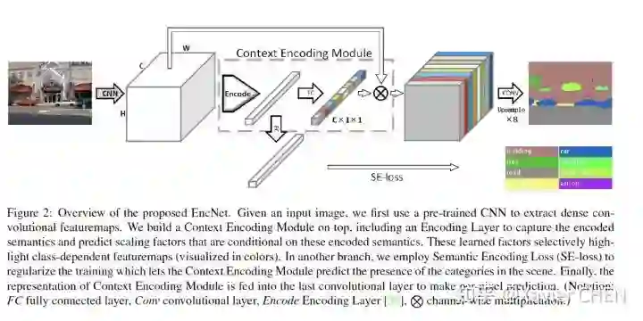这篇算很有代表性的文章,文章的主旨是建立一个Context Encoding Module用于对场景进行编码,由于不同的场景中不同的物件出现的可能性不一样。比如在天空的场景中,就要强化飞机的概率,不能强化船的概率。本文用Global Pooling得到场景特征,利用类似于senet的思想建立channel之间的关系。