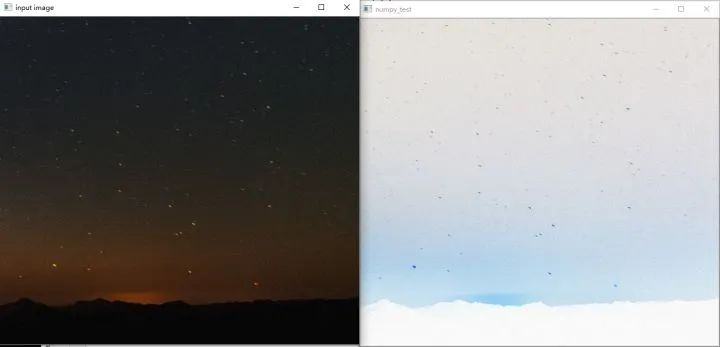 import cv2 as cvimport numpy as npdef access_pixel(image):#属性的读取print(image.shape)height = image.shape[0]width = image.shape[1]channels = image.shape[2]print("width: %s, height: %s, channels: %s"%(width,height,channels))#遍历每一个像素点,太慢了,更新for row in range(height):for col in range(width):for c in range(channels):pv = image[row,col,c]image[row,col,c] = 255-pvcv.imshow("numpy_test",image)def inverse(img):dis = cv.bitwise_not(img)cv.imshow("inverse",dis)def create_image():'''img = np.zeros([400,400,4],np.uint8)img[ :, :,0] = np.ones([400,400])*255 #对通道进行赋值,0是蓝通道,1是绿通道,2是红色通道,多通道cv.imshow("new_image",img)'''#初始化灰度图像img2 = np.zeros([400,400,1],np.uint8)img2[:,:,0] = np.ones([400,400])*127#img2 = img2*127cv.imshow("new_image_2",img2)#维度变换m1 = np.ones([3,3],np.uint8)m1.fill(12222.388)print(m1)m2 = m1.reshape([1,9])print(m2)print("---------HELLO-----PYTHON--------------------")src = cv.imread("D:/1.png")cv.namedWindow("input image",cv.WINDOW_AUTOSIZE)cv.imshow("input image",src)t1 = cv.getTickCount()#access_pixel(src)#create_image()inverse(src)t2 = cv.getTickCount()#测试时间消耗time = (t2-t1)/cv.getTickFrequency()print("time:%s ms"%(time*1000))cv.waitKey(0)cv.destroyAllWindows()