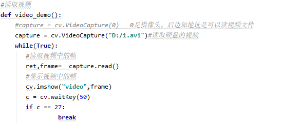 读取视频分为从摄像头中读入和从硬盘中读入,如果是摄像头就在videocapture函数中填写数值,0是默认的第一个摄像头,1.是第二个,以此类推,如果没有外置摄像头,就直接“”填写路径就行。
