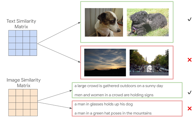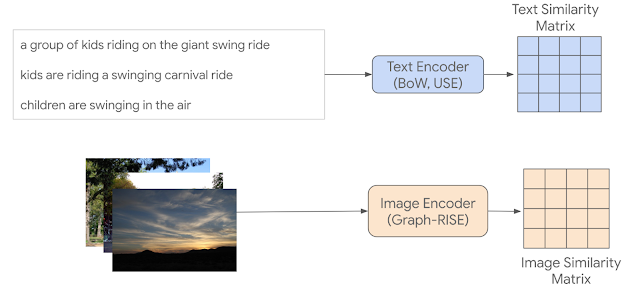 鉴于随机选择的图像和描述配对可能不同,我们提出了一种方法,选择项目以进行人工评分,从而至少得到一些具有较高预期相似度的新配对。为了减少所选配对对用于查找它们的模型的依赖性,我们引入了间接采样方案(如下图所示),在该方案中,我们使用不同的编码方法对图像和描述进行编码,并计算相同模态项配对之间的相似度,从而得出相似度矩阵。我们使用 Graph-RISE 嵌入对图像进行编码,使用通用句子编码器 (USE) 和基于 GloVe 嵌入的平均词袋 (BoW) 等两种方法对描述进行编码。由于每个 MS-COCO 示例都有五个辅助描述,我们对辅助描述编码进行平均化处理,以创建每个示例的单一表征,从而确保所有描述对均可映射到图像对(有关如何选择模态间配对,请参阅下文)。