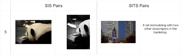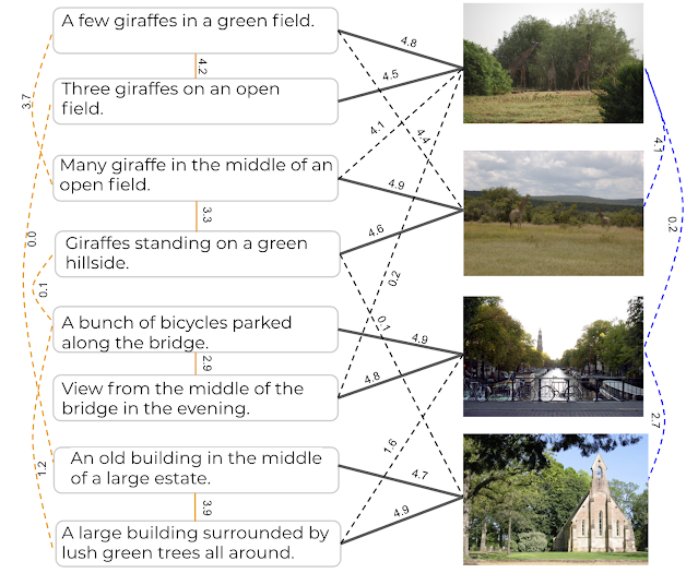 最后,我们使用这些新的模态内配对及其人工评分,以选择新的模态间配对进行人工评分。我们的方法是使用现有的图像-描述对在模态间进行关联。例如,如果人类将一个描述对示例 ij 评为高度相似,我们会从示例 i 中选取图像,从示例 j 中选取描述,从而获得一个新的模态间配对以进行人工评分。同样,我们使用相似度评分最高的模态内配对进行采样,因为其中至少包括一些具有高相似度的新配对。最后,我们还为所有现有的模态间配对和大型辅助描述示例添加了人工评分。