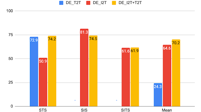 对于相关性任务,DE_I2T 在 SIS 方面表现最好,而 DE_I2T+T2T 总体表现最佳。相关性得分还显示,DE_I2T 仅在图像方面表现良好:其 SIS 最高,但 STS 却差很多。在 DE_I2T 训练中加入文本-文本损失 (DE_I2T+T2T) 可以使整体性能更为均衡。
