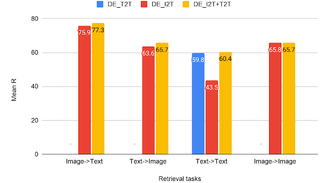 从检索任务的结果可以看出,在图像-文本和文本-图像检索任务中,DE_I2T+T2T(黄色条)的性能优于 DE_I2T(红色条)。因此,添加模态内(文本-文本)训练任务有助于提高模态间(图像-文本、文本-图像)的性能。至于其他两项模态内任务(文本-文本和图像-图像),DE_I2T+T2T 在这两项任务中均表现出强大而均衡的性能。