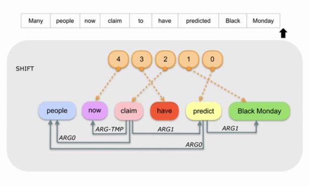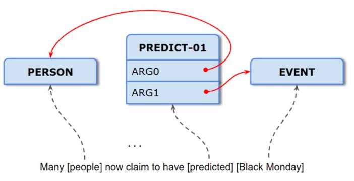 下图介绍了 SLING 如何识别实体(如人、地名或事件)、度量(如日期或距离)和其他概念(如动词),然后将它们按正确的语义角色进行排序。单词 predicted 表示动词「predict」最主要的意思,因此被标注为 PREDICT-01 框架。另外,该框架还与作出预测的人(通过 ARG0 slot 进行标注,指向代表 people 的 PERSON 框架)和被预测的事物(通过 ARG1 slot 进行标注,指向代表 Black Monday 的 EVENT 框架)有相互作用(slot)。框架语义分析即通过 slot 生成这些连接框架的有向图。