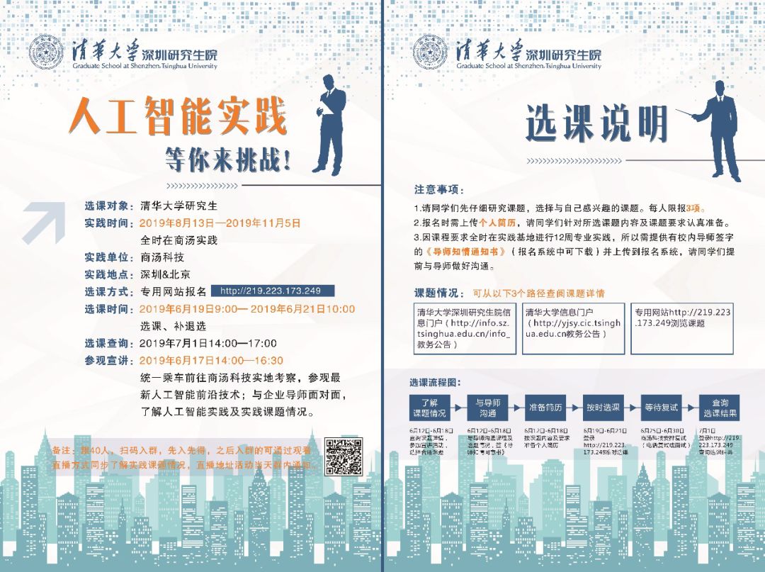 参观宣讲: 2019年6月17日14:00——16:30 统一乘车前往商汤科技实地考察,参观最新人工智能前沿技术;与企业导师面对面,了解人工智能实践及实践课题情况。