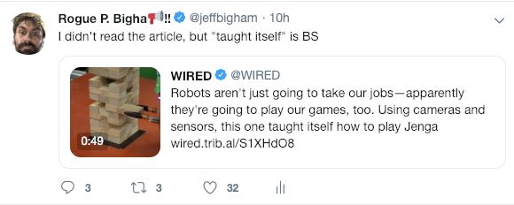 一台机器人不可能自己学习如何玩层层叠游戏。首先承认,我没读推文链接中的文章,但毫无疑问的是,有一帮家伙打算让一台机器人学会玩层层叠。人类,付出了巨大的努力,构建起一套复杂的系统,使得机器人能够利用某种数据进行自主学习。这些数据一般来自人类的亲身试验,或者由人类通过适当设置进行强化,从而确保机器人能够在“自己玩”的过程中掌握其中的诀窍。换言之,这一切,都需要人类的参与。