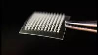 为了达到这一目的,科学家们先将药物装进直径约为250纳米的纳米颗粒中,然后,这些纳米颗粒被装进包含大量微针(microscopic needles)的一平方厘米大小的贴片上(如下图)。当被贴到皮肤上时,这些微针会无痛地刺入皮肤中,逐步从纳米颗粒中释放药物到下面的组织中。