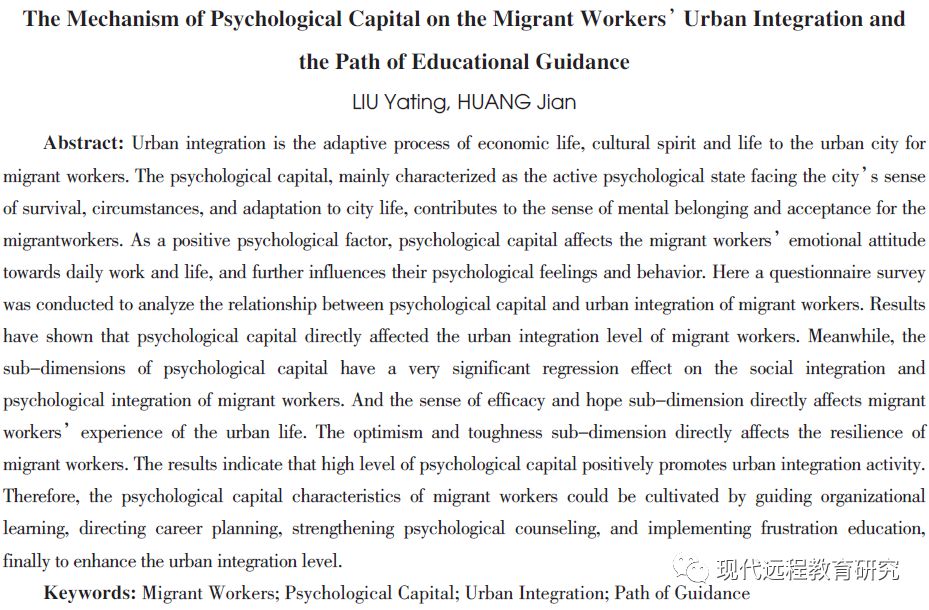 引用:刘雅婷,黄健(2018).心理资本对农民工城市融入的作用机制及教育规导路径[J].现代远程教育研究,(3):49-58.