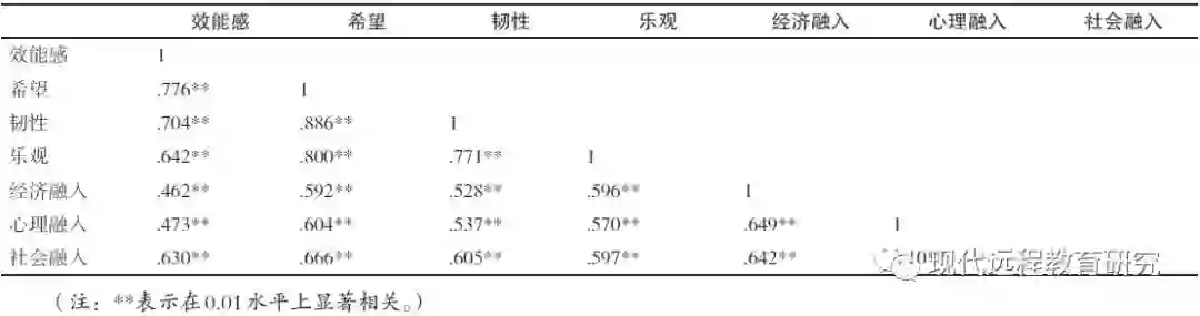 为进一步探究心理资本及其各维度与城市融入水平之间的因果关系,以城市融入中经济融入、社会融入、心理融入三个维度为因变量,以心理资本中效能感、希望、韧性、乐观四个维度为自变量进行三次多元回归分析及其显著性检验。据回归分析结果可知,效能感、希望、韧性、乐观四个维度对社会融入均达到了0.05层面的回归效应(见表6中Sig.值),假设H3成立;对心理融入均达到了0.001层面的回归效应,假设H4成立;对经济融入回归效应不显著,假设H2成立。农民工城市融入的过程中,心理资本的各维度直接作用于其社会与心理层面的融入感受,最终影响其城市融入水平。尽管心理资本各维度与经济融入水平不存在显著性的正向作用,但经过相关分析发现效能感、希望、韧性、乐观与经济融入、社会融入、心理融入之间均呈现0.01层面的显著性正相关(见表7),说明心理资本可以在一定程度上影响个体的经济融入水平,但不存在直接性的正向作用。