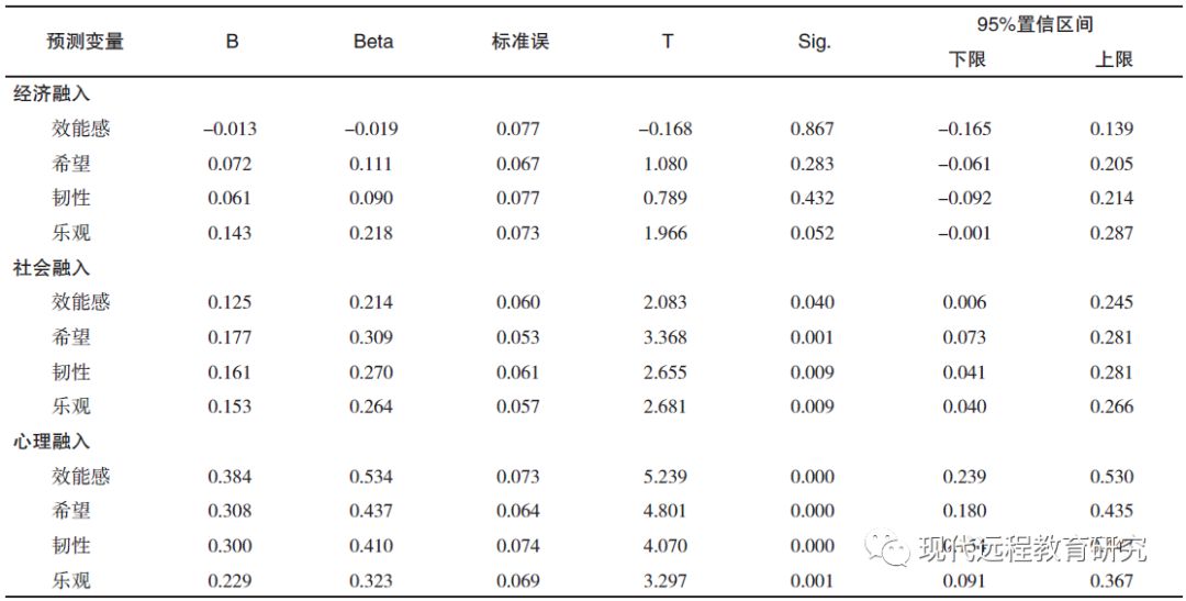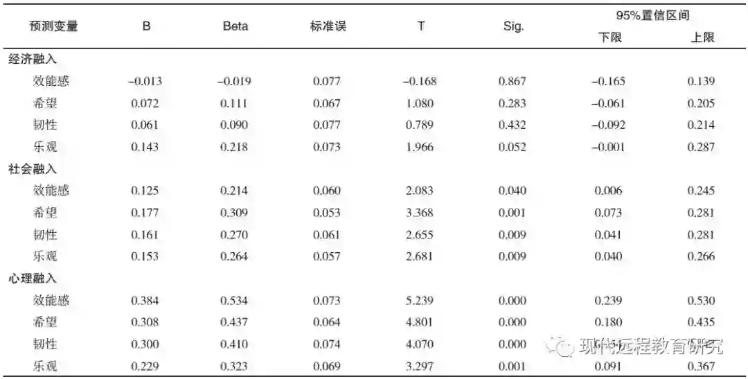 2.心理资本与城市融入各维度的多元回归分析