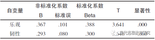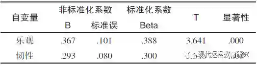 表9乐观及韧性与挫折复原力回归系数及显著性检验表