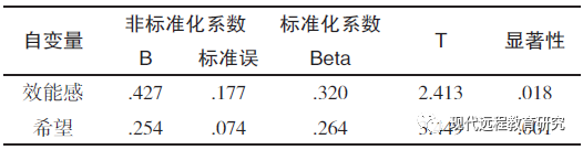表8 效能感及希望与城市生活感受回归系数及显著性检验表