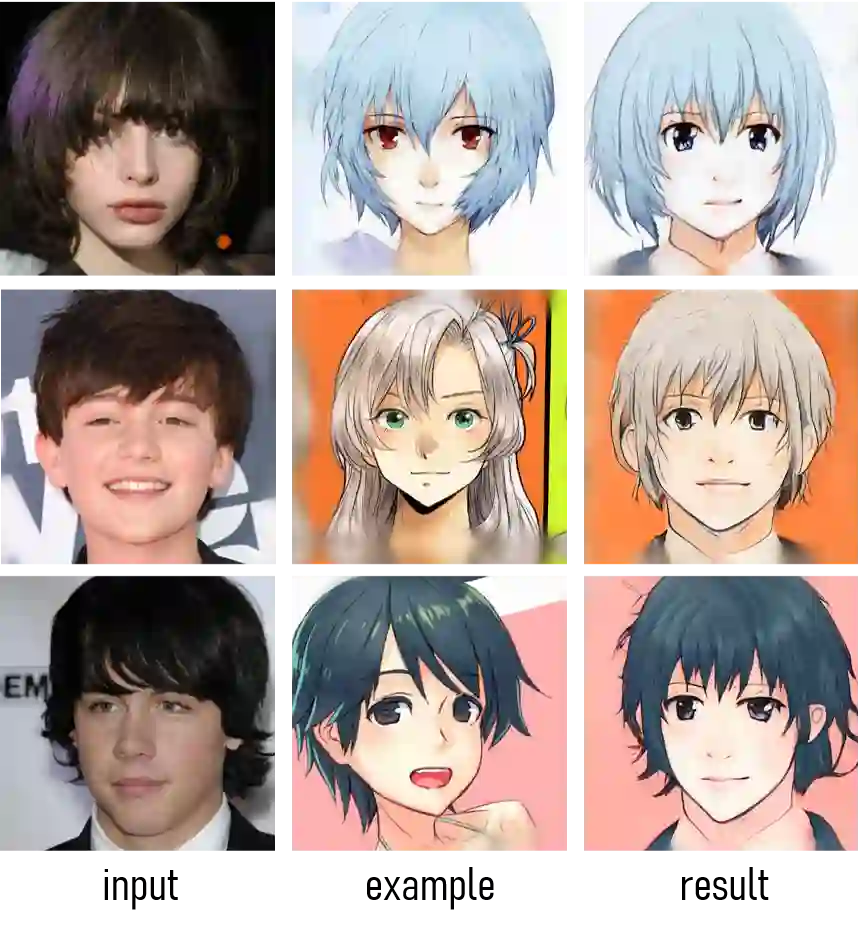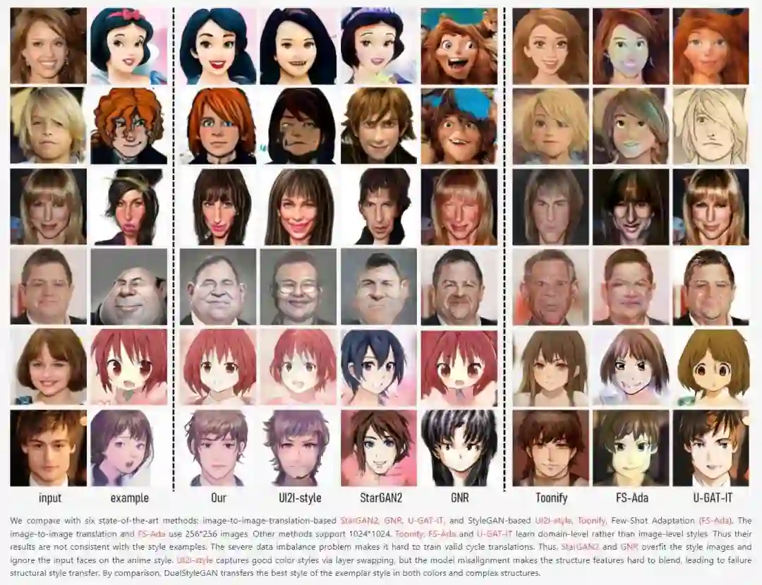 下面图片展示了 DualStyleGAN 与当前 State-of-the-art 方法的对比结果。 作者比较的对象包含 6 种方法,包含 image-to-image-translation-based StarGAN2, GNR, U-GAT-IT, 和 StyleGAN-based UI2I-style, Toonify, Few-Shot Adaptation (FS-Ada),结果显示 DualStyleGAN 能够很好地迁移参考图片中的颜色和结果信息!