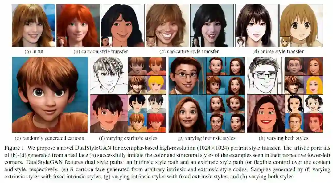 本文作者来自南洋理工大学,作者提出 DualStyleGAN,来做基于参考样例的高分辨率 (1024x1024) 肖像风格迁移,DualStyleGAN 能够灵活控制原始人脸域和艺术肖像域的两种风格,其与 StyleGAN 不同,通过使用 intrinsic style path 和新介绍的 extrinsic style path 来表征肖像的内容和风格以提供更加自然的风格迁移。作者精心设计的 extrinsic style path 使得 DualStyleGAN 能够层次化地对颜色和复杂的结构风格进行建模,从而能够精确复刻参考样例的风格。此外,DualStyleGAN 对训练数据非常高效,只需大约 200 张图片,便可以训练得到不错的结果,