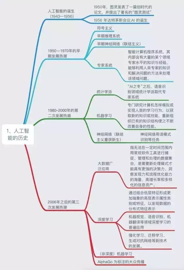 这些知识网络图清晰明确地介绍了人工智能的前世今生、内涵意义等信息,可以说是包罗了人工智能的各类相关知识。人工智能是未来一大热点,如果你也看好这一趋势,不妨把这张图收藏起来慢慢看。