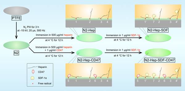 近日,中国科学院深圳先进技术研究院医药所生物医用材料与界面研究中心王怀雨课题组与教授朱剑豪合作,在生物医用高分子材料的表面功能化改性方面取得新进展。研发团队提出了一种“等离子体浸没离子注入+溶液浸泡”的创新表面改性方法,能够简便、高效地将功能性生物分子共价接枝在生物医用高分子材料表面,从而显著改善其表面的生物学性能。相关论文 Linker-free covalent immobilization of heparin, SDF-1α, and CD47 on PTFE surface for antithrombogenicity, endothelialization and anti-inflammation(《肝素、SDF-1α和CD47在聚四氟乙烯表面的无交联剂共价接枝以抗血栓、促内皮化和抗炎症》)已在线发表在《生物材料》(Biomaterials)上,论文的第一作者是高昂。