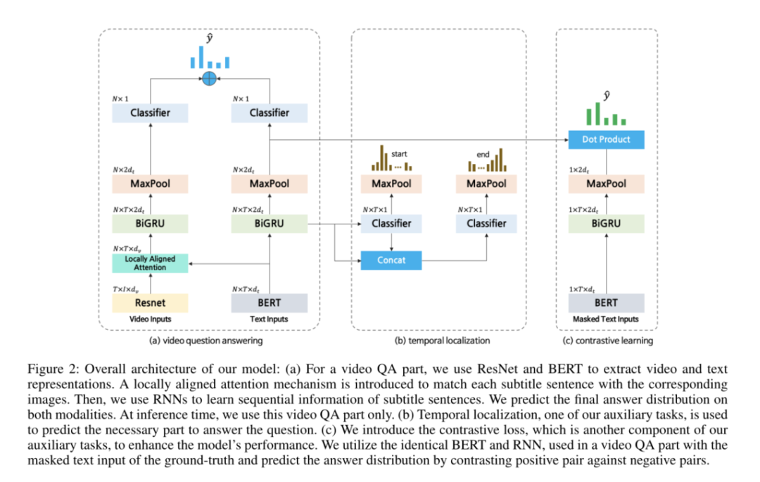 摘要:视频问答(Video QA)要求对视频和语言模态有深入的了解,才能回答给定的问题。在本文中,我们提出了一种新的针对多选视频问答的训练方案,该方案以自监督的预训练阶段和主要阶段的监督对比学习作为辅助学习。在自监督的预训练阶段,我们将预测正确答案的原始问题格式转换为预测相关问题的格式,以提供具有更广泛上下文输入的模型,而无需任何其他数据集或注释。为了在主要阶段进行对比学习,我们在与真实答案相对应的输入中添加了掩码噪声,并将真实答案的原始输入视为正样本,而将其余答案视为负样本。通过将正样本映射到更接近被屏蔽的输入,我们表明模型性能得到了改善。我们进一步采用局部对齐的注意力来更有效地专注于与给定的对应字幕句子特别相关的视频帧。我们在与多选Video QA相关的基准数据集TVQA,TVQA +和DramaQA上评估了我们提出的模型。实验结果表明,我们的模型在所有数据集上均达到了最先进的性能。我们还将通过进一步的分析来验证我们的方法。