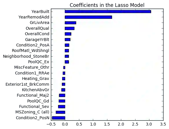 用LASSO模型预测测试数据,我们得到的均方根误差为0.1209,这已经足以在排行榜上取得前25%的名次了。