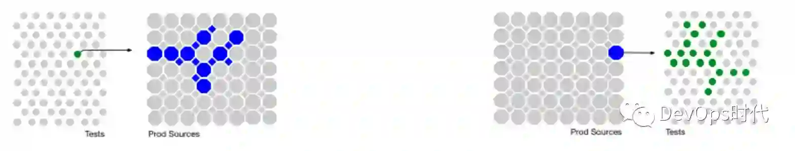 这一想法的关键在于, 并非所有的测试都可以覆盖到产品源代码文件 (或从 该源文件生成的类)。代码覆盖率或代码检测, 这些白盒测试运行的时候,就会 收集到很多信息,这些信息 (详情如下)。从一个源代码和测试之间的关系信息 图开始, 并最终整理成整体产品代码和测试之间的关系图。