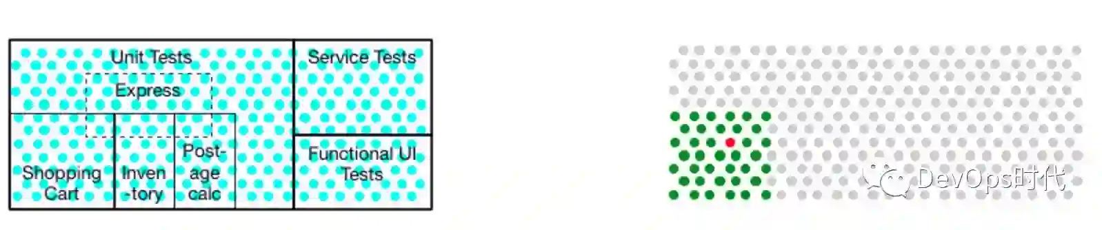 左图:对单元、服务和功能 UI 进行分组。在单元测试中,对有意义的子组进行标记,包括一个 "express", 它对其他的子集进行抽样。