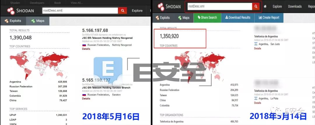 通过2018年5月16日与14日的 SHODAN 搜索情况对比显示,暴露 rootDesc.xml 文件的路由器数量仍在增加。