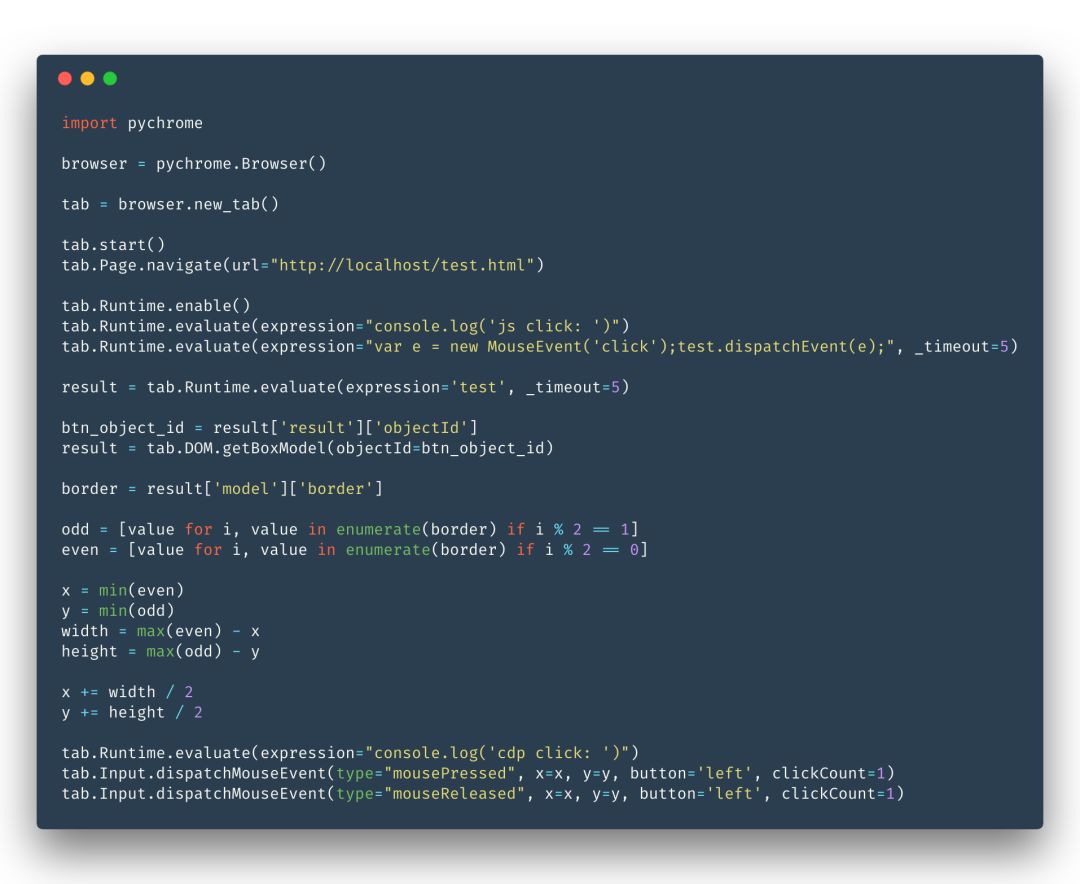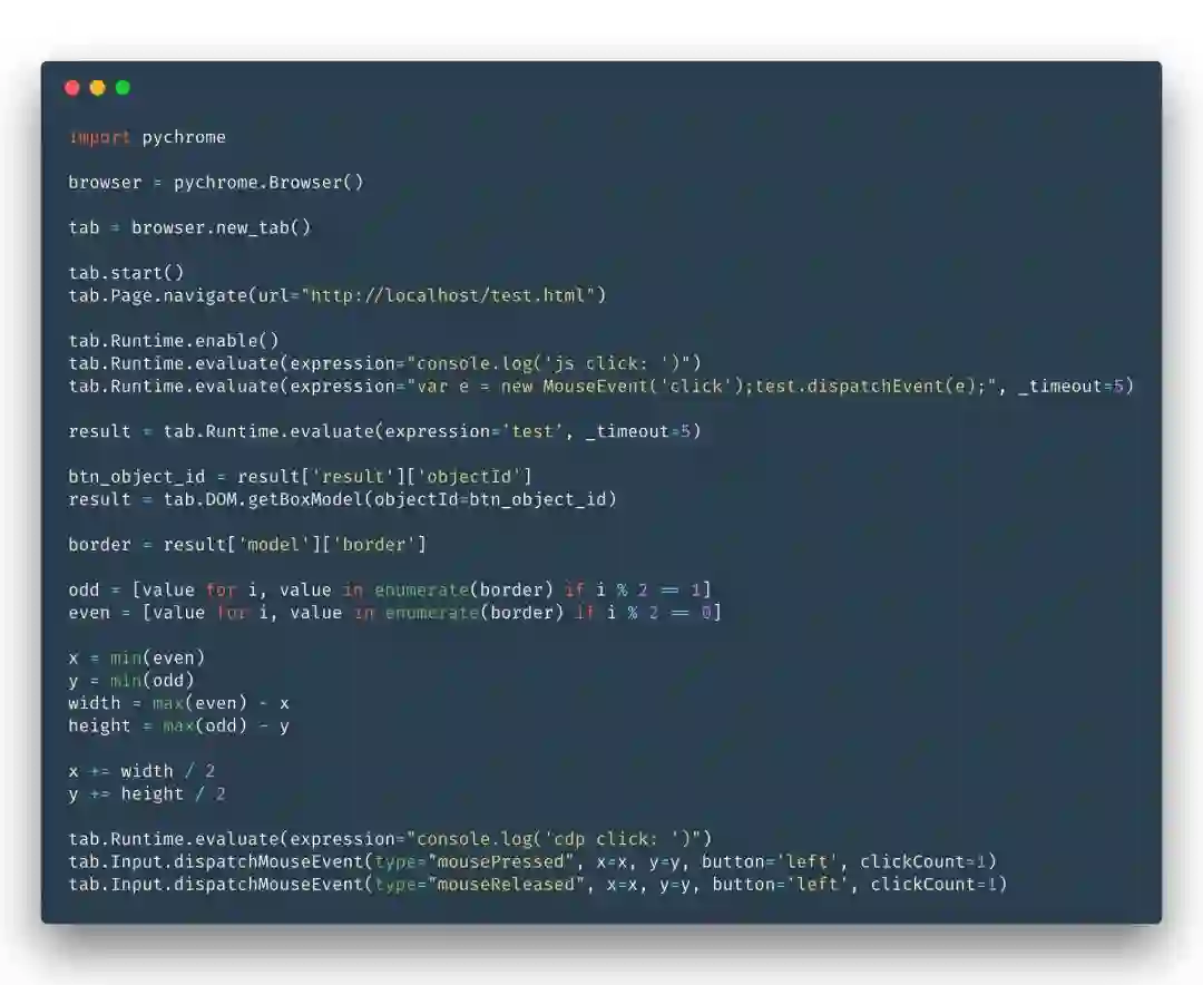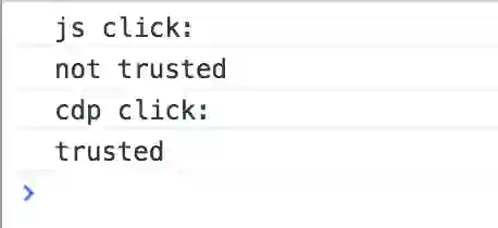 dispatchEvent 和 Input.dispatchMouseEvent 这两者最大的区别就是事件来源是否是真实的用户点击, 虽说 isTrusted 也就是一个改 Chromium 代码就能解决的问题,但我们也没法保证还有没有其他黑科技来检测是否事件是否来自真实用户。 然而我还是觉得 CDP 实在太慢,所以还是继续选择使用 dispatchEvent 来触发各种事件。