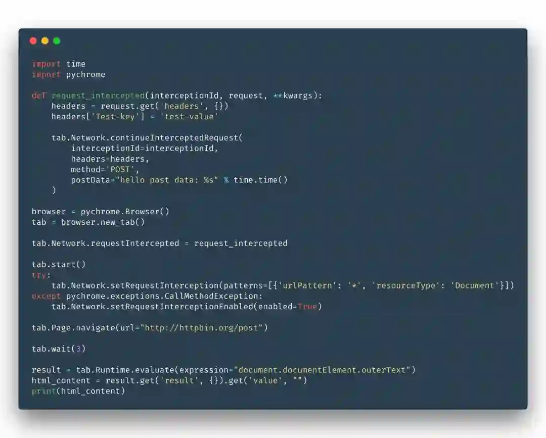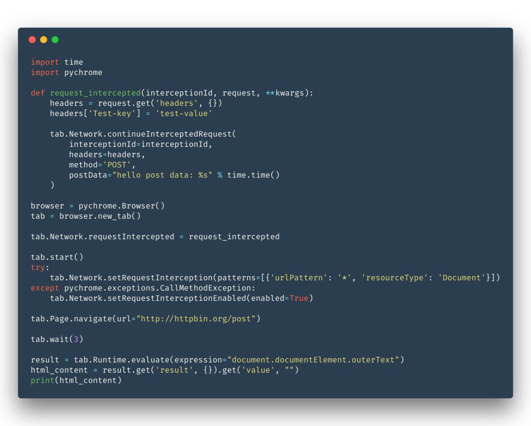 CDP 在 navigate 的时候并不能直接自定义 request,通俗的讲就是在 navigate 的时候并不能设置 method 和 headers 等信息, 但很明显这个功能对我们的扫描器来说非常重要。幸运的是,虽然 CDP 没有直接支持这样的功能,但可以通过 Network.requestIntercepted 变向实现这样的功能。