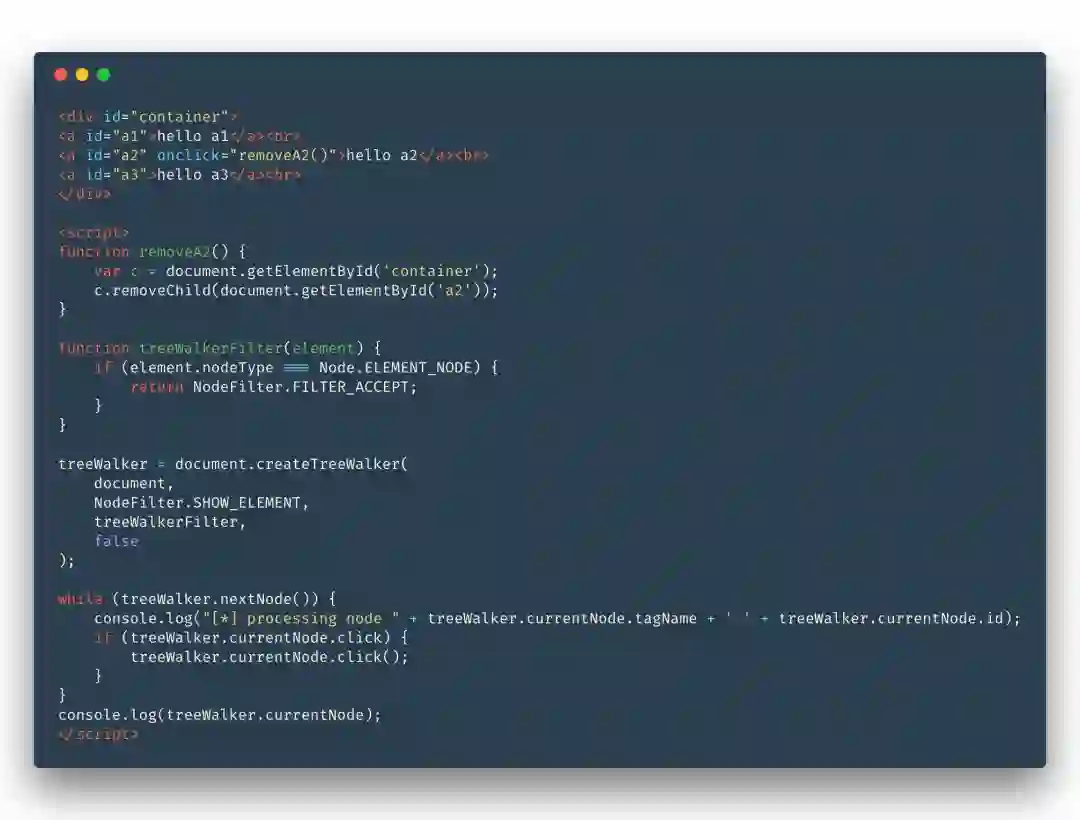 是的,如果 TreeWalker 刚好走到一个节点,触发了事件使得该节点离开了 DOM 树,那 TreeWalker 就走不下去了, 所以比较保险的方法就是在页面稳定后收集一份静态的节点列表,再触发事件,也就是使用 TreeWalker 的第一种玩法。