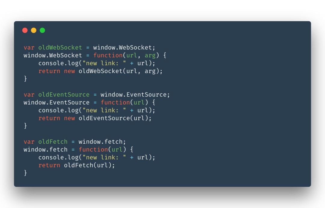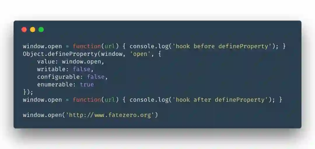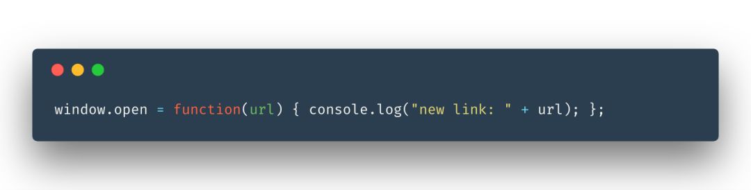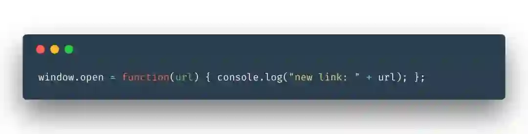 因为之前我们修改了 Chromium 代码使得 window.open 无法新建窗口,这样在 CDP 中也没法获取 window.open 想打开的链接信息,所以我们还需要在代码中 Hook window.open 函数: