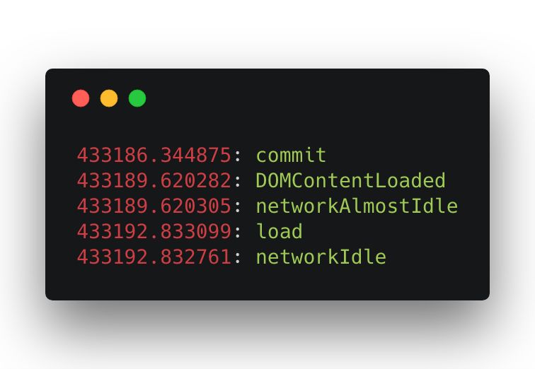 我们先说一下这几个事件的触发顺序,首先这几个事件触发顺序不一定,例如触发时间 load 事件不一定比 DOMContentLoaded 晚,load 也不一定比 networkAlmostIdle 晚。唯一能确定的就是 networkAlmostIdle 一定比 networkIdle 晚。在一般的情况下时间顺序是 DOMContentLoaded -> networkAlmostIdle -> networkIdle -> load。