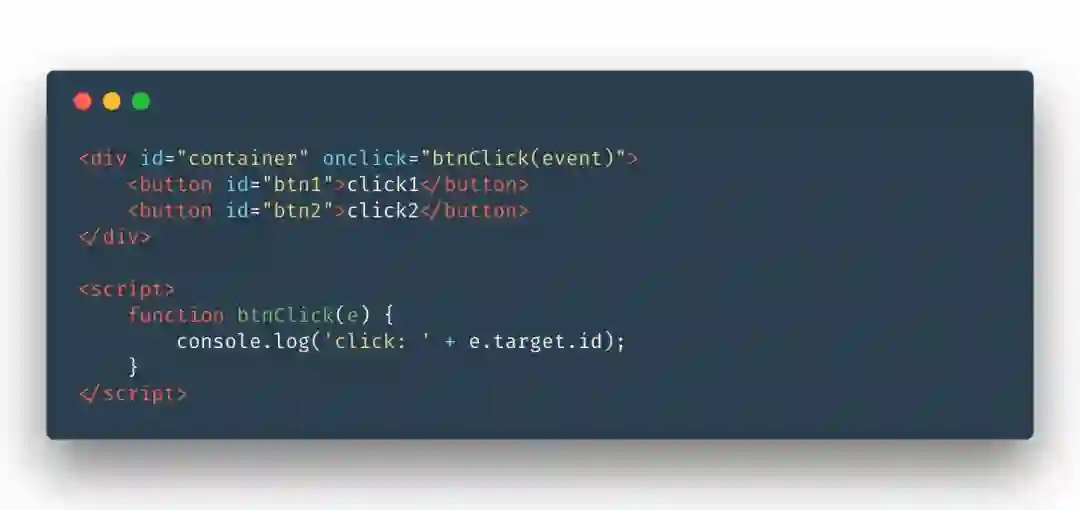 例子将事件绑定在 container 内,等事件冒泡到 container,再通过 event.target 区分元素。 如果按照之前的思路,我们的代码将会在 container 中触发一个点击事件,而忽略了 container 下的两个按钮,所以之前的思路并不合理。
