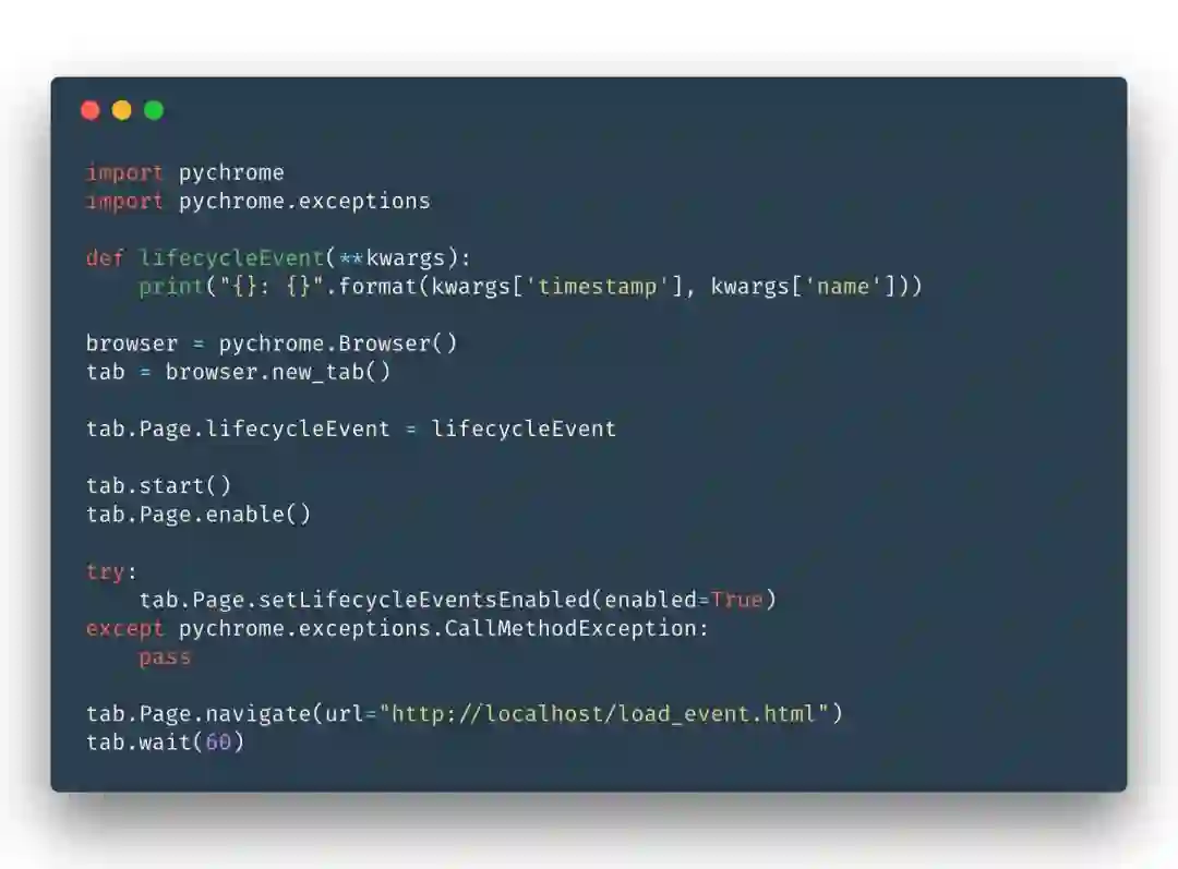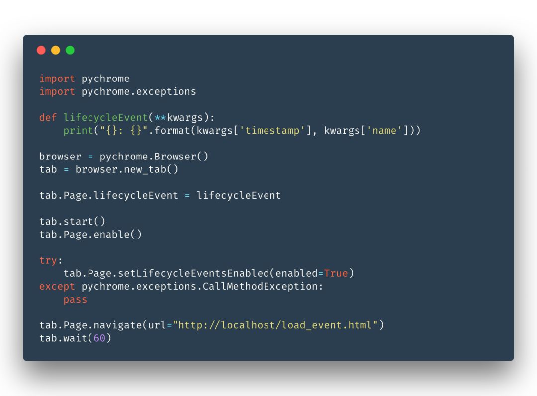 页面加载前的定义非常简单,只要能在用户代码执行前执行我们注入的 JavaScript 代码即可,也就是在页面创建之后、用户代码执行之前的时间段对于我们来说都算是页面加载前,CDP 刚好提供了这么一个 API Page.addScriptToEvaluateOnNewDocument 能够让我们在页面加载前注入 JavaScript 代码。