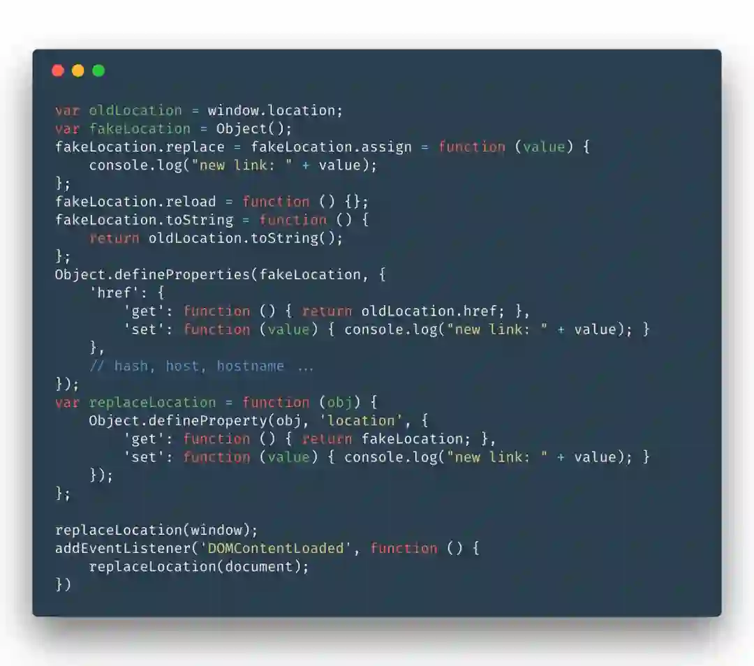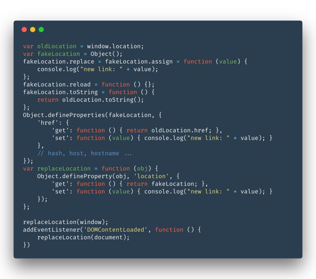 这里还需要注意的是 doucment.location 需要等待 DOM 构建结束之后才能 hook, 所以需要注册 DOMContentLoaded 事件来 hook document.location。
