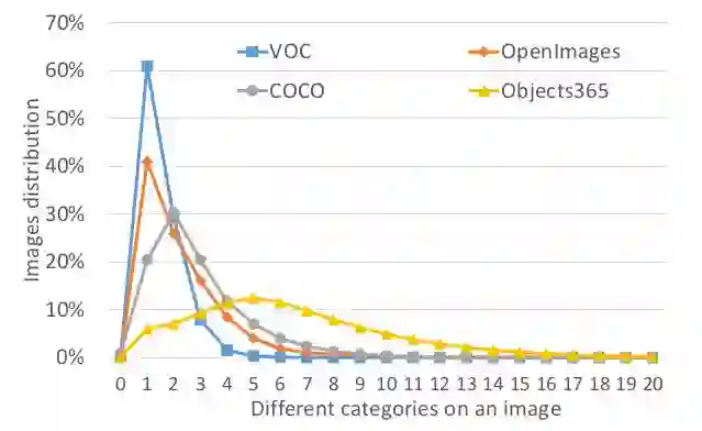 VOC/COCO/OpenImages/Objects365 数据集中,图像包含类别数的对比