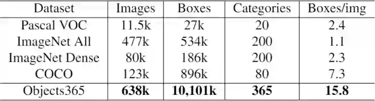 Objects365 是一个全新的数据集,旨在促进物体检测研究。训练集大小为 638K,包括 63 万张图像,标注了 365 个对象类,其中包括超过 1000 万个边界框,每张图像平均标注框为 15.8 个,涵盖了基本上所有常见的对象。