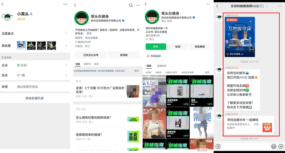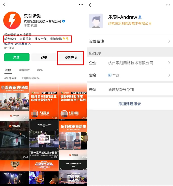 乐刻运动视频号的引流和内容以商业性为主,首页介绍明确想成为教练、加盟、合作的可添加微信,而视频内容也主要是赋能、品牌活动、品牌宣传、联名综艺等内容。