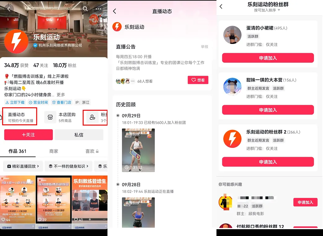 乐刻运动在抖音粉丝共有18万,首页有直播动态,点击后可预约直播,有3个粉丝群,有2个是以教练命名,1个是品牌命名。