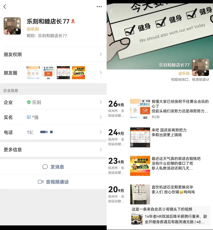 其中,朋友圈一半是活动信息同步、课程安排以及门店状况通知,剩下都是记录个人生活和健身房的动态。个人生活内容也多为健身为主,传达健康生活的同时也强化IP定位。