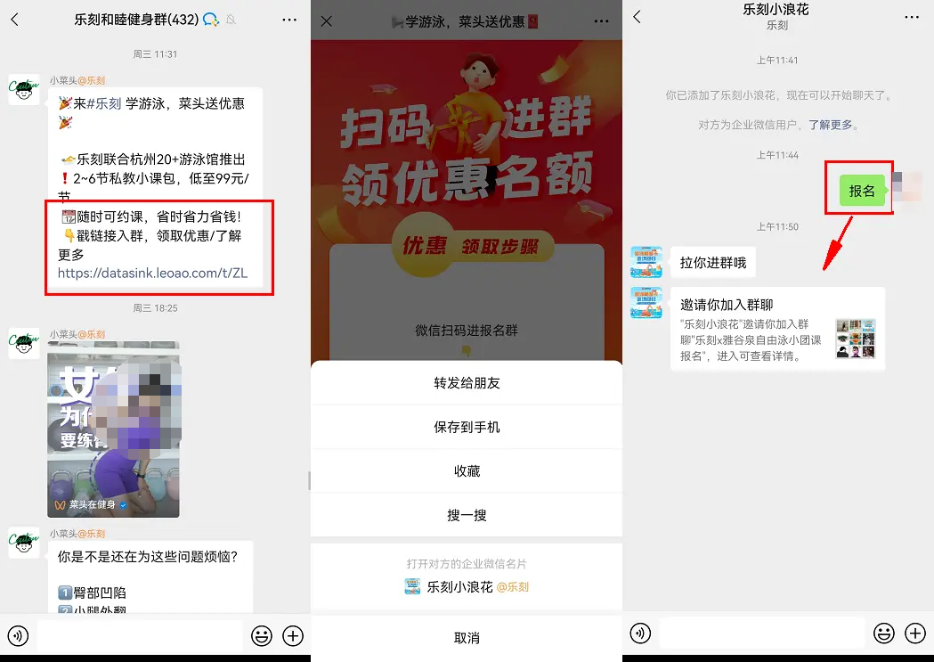 乐刻运动联合杭州游泳馆推出游泳课,群内会引导用户入群,添加企微后回复关键次报名,即可入群。
