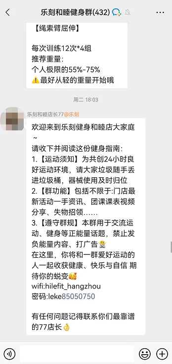 用户入群后会第一时间触发自动欢迎语,主要介绍健身房活动须知,群价值,以及群规和有问题可以咨询店长,表明服务态度。
