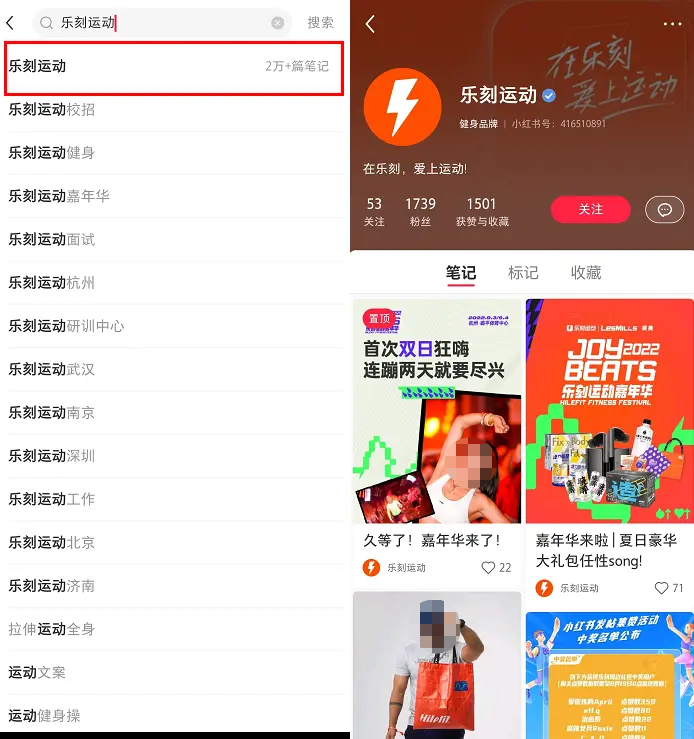 乐刻运动在小红书有2w+的笔记数,主账号粉丝1700+,笔记主要是品牌活动、周边、互动有奖、户外运动等内容。