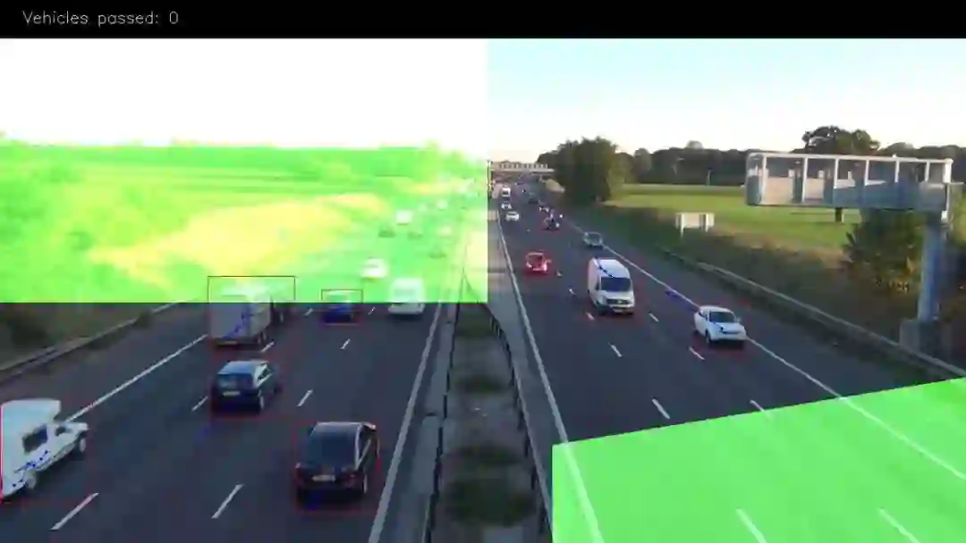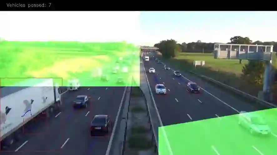 上面的图像中绿色的部分是出口区域。我们在这里对车辆进行计数,只有当车辆移动的长度超过3个点我们才进行计算。