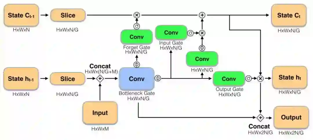 2、LSTM单元分组卷积。特征图HxWxN分为G组,每个LSTM仅处理HxWxN/G的特征,加速ConvLSTM计算。论文中G = 4。
