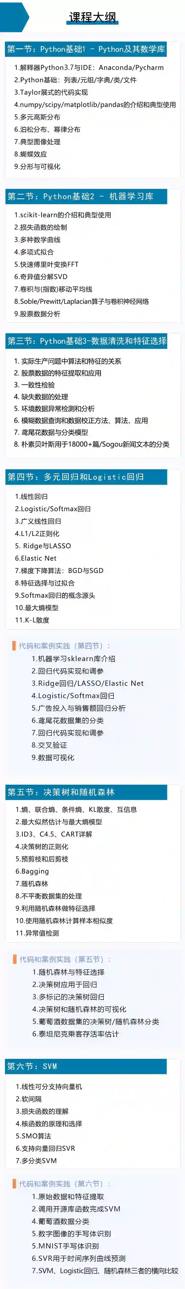 课程强调动手操作;内容以代码落地为主,以理论讲解为根,以公式推导为辅。共16天16个模块32个学时,每学时各1~1.5小时,136个知识点,82个代码和案例实践,讲解机器学习和深度学习的模型理论和代码实践,梳理机器学习、深度学习、计算机视觉的技术框架,从根本上解决如何使用模型、优化模型的问题;每次课中,首先阐述算法理论和少量公式推导,然后使用真实数据做数据挖掘、机器学习、深度学习的数据分析、特征选择、调参和结果比较。