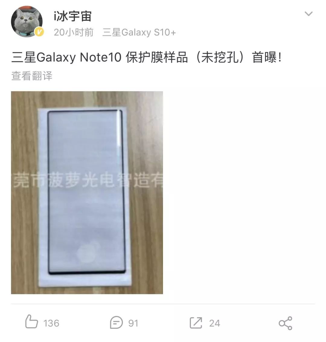 后置摄像头从之前的居中横置排列变为左上角竖置排列。冰宇宙近期也曝光了Galaxy Note10保护膜。从爆料图来看,Note10的正面设计硬朗,R角很小,整体看上去方正的造型也符合Note系列的一贯设计特点。